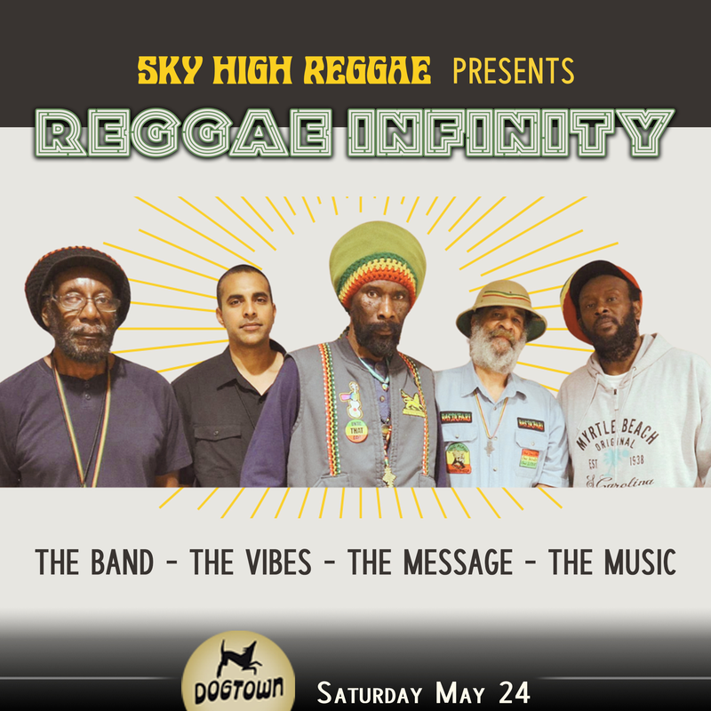 Sky High Reggae presents ReggaeInfinity in concert on Saturday, May 24, 2025 at Dogtown Roadhouse.