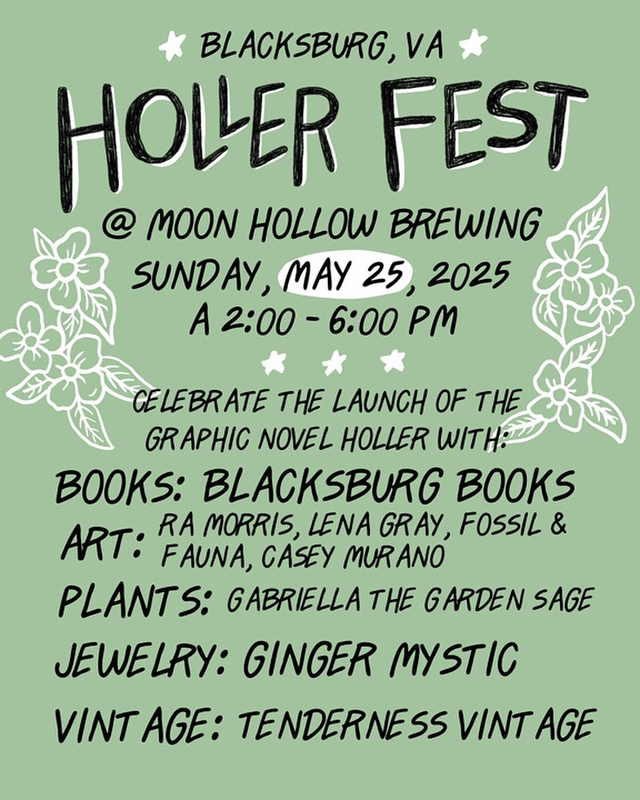 Celebrate the book launch of the graphic novel "Holler: A Graphic Memoir of Rural Resistance" by local author Denali Nalamalapu. It will be an afternoon of fun with local art vendors and pop up shops including Blacksburg Books, Gabriella The Garden Sage, Ginger Mystic, Tenderness Vintage, RA Morris, Lena Gray, Fossil & Fauna and Casey Murano.
