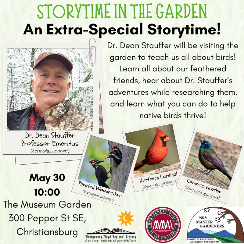 There's an extra-special storytime coming at the end of May! Join the MFRL Bookmobile in the Montgomery Museum of Art & History garden, along with our amazing New River Valley Master Gardener Association friends, to learn all about birds. Dr. Stauffer, former Virginia Tech professor, will be teaching us how to be proper bird nerds so we can help our feathered friends flourish!