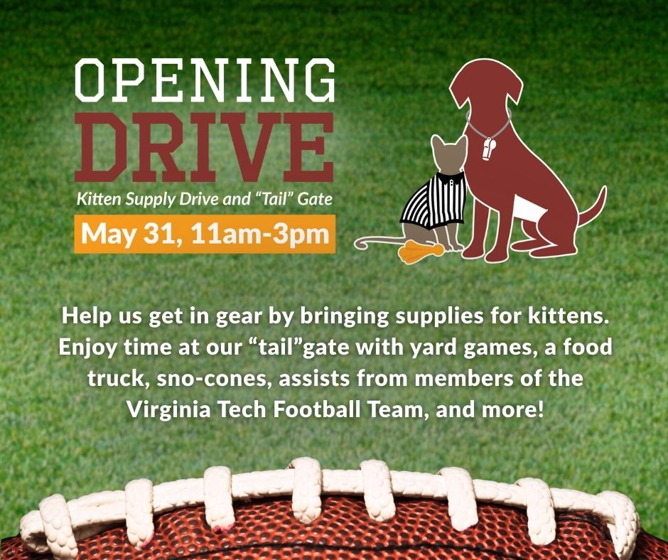 Help us get in gear by bringing supplies for kittens. Enjoy time at our "tail" gate featuring yard games, a food truck, sno-cones and assists from members of the Virginia Tech Football Team and more!