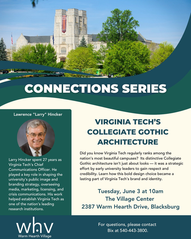Warm Hearth Village continues their Connections Series with a program on Virginia Tech’s Collegiate Gothic Architecture on Tuesday, June 3, 2025 at the Warm Hearth Village Center.
