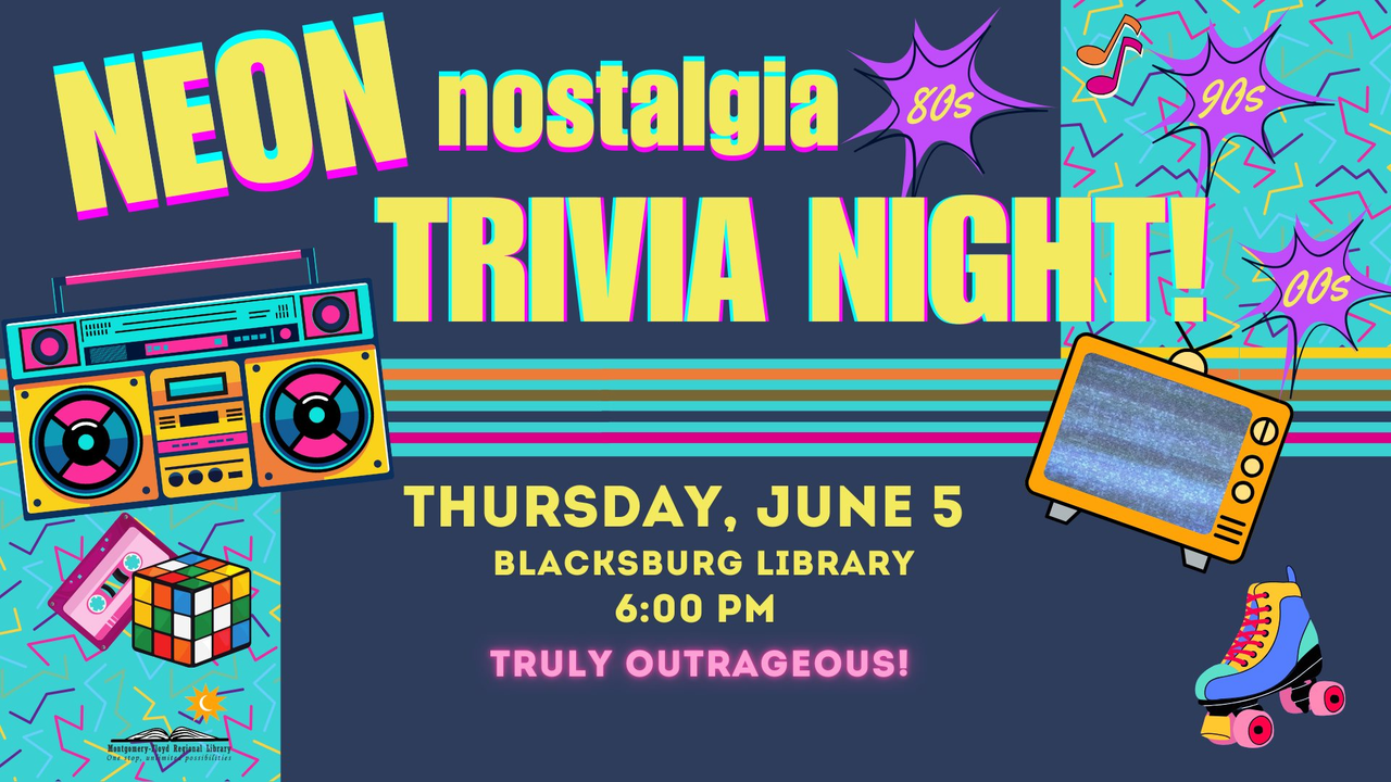 The Blacksburg Library presents Neon Nostalgia Trivia Night on Thursday, June 5, 2025.