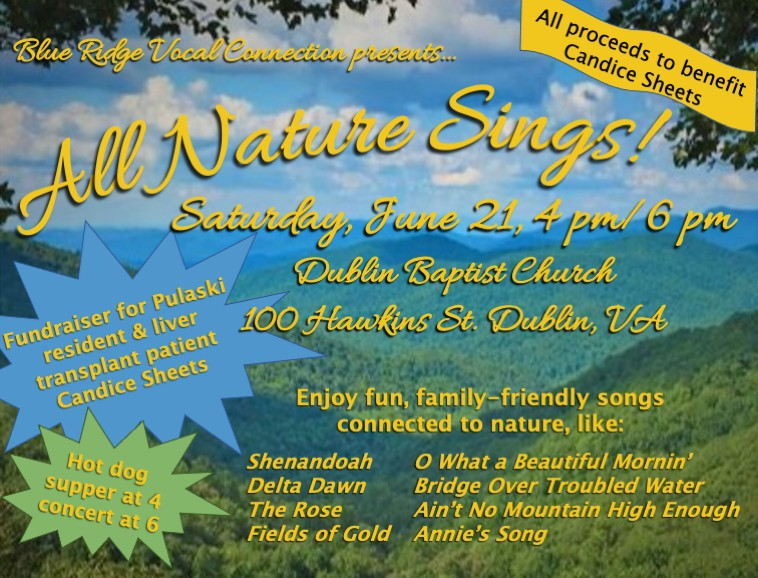 The Candice East Sheets Fundraising Dinner and Blue Ridge Vocal Connection All Nature Sings Concert will be held on Saturday, June 21, 2025 at the Dublin Baptist Church.