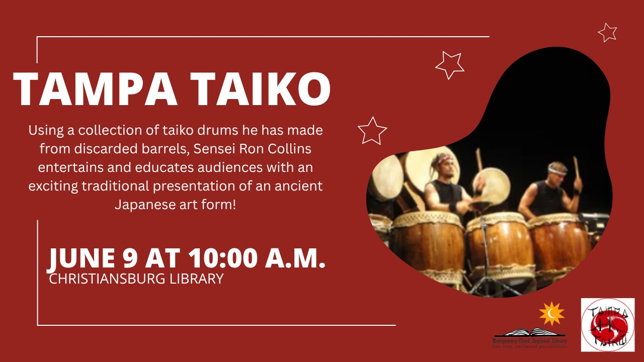The Christiansburg Library presents the program "Tampa Taiko Japanese Drums" on Monday, June 9, 2025.