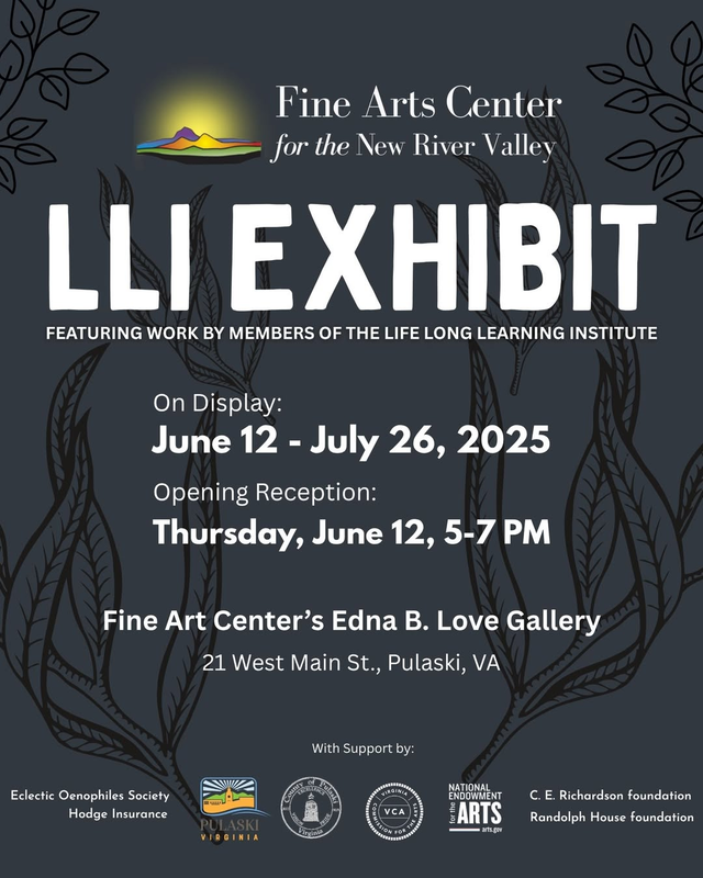 The Fine Arts Center for the New River Valley presents the Opening Reception for Life Long Learning Institute Exhibit (LLI) on Thursday, June 12, 2025.