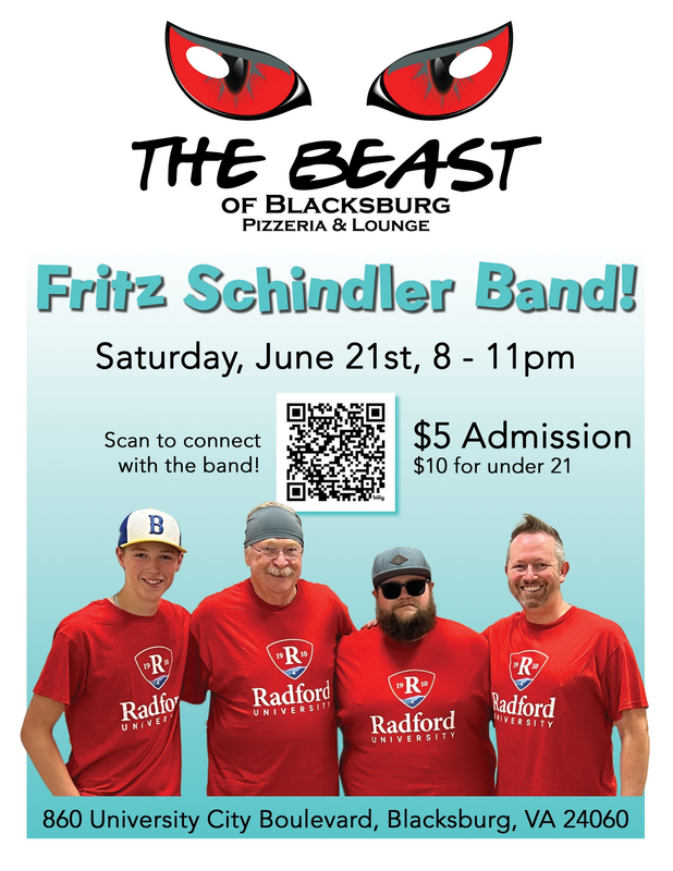 The Beast of Blacksburg Pizzeria & Bar presents Fritz Schindler in concert on Saturday, June 21, 2025.