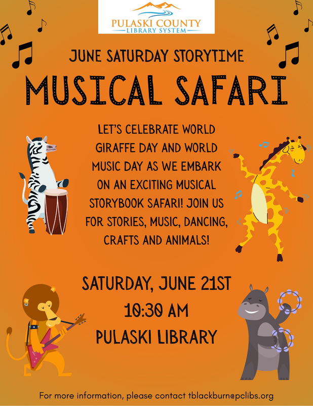 The Pulaski County Library presents June Saturday Storytime Musical Safari on Saturday, June 21, 2025.