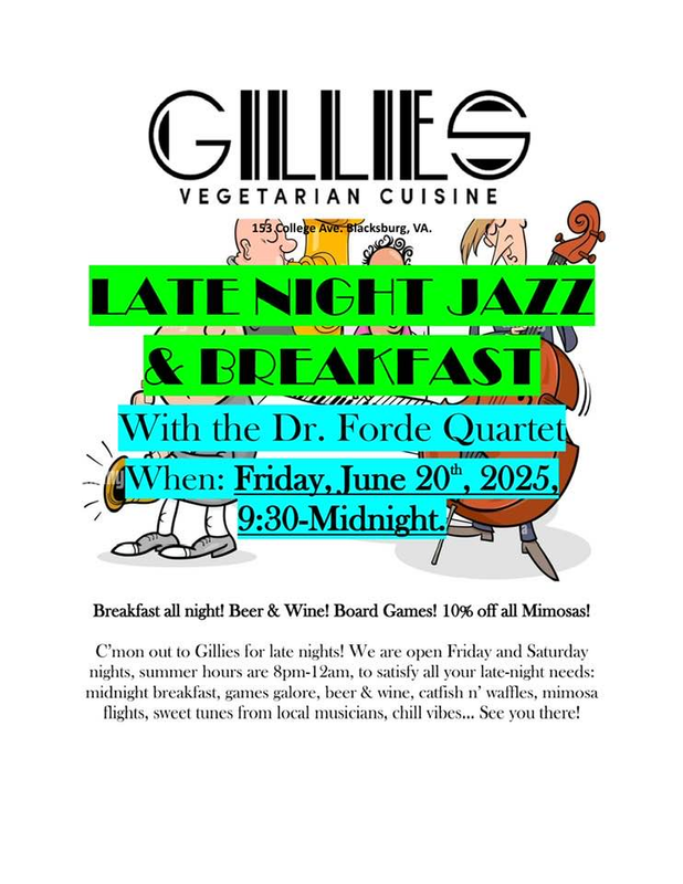 Gillie's presents Gillie's Late Nights with Breakfast All Night and Dr. Forde's Jazz Quartet in concert on Friday, June 20, 2025.
