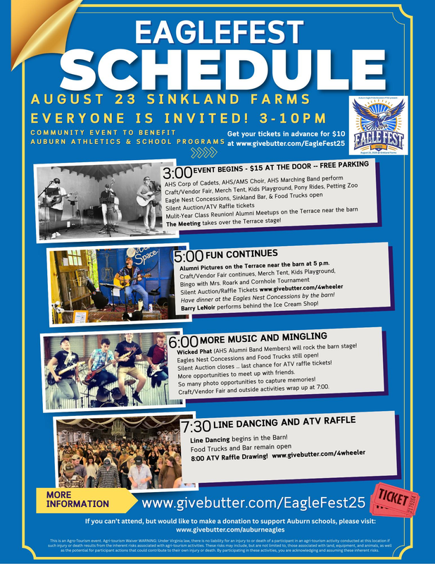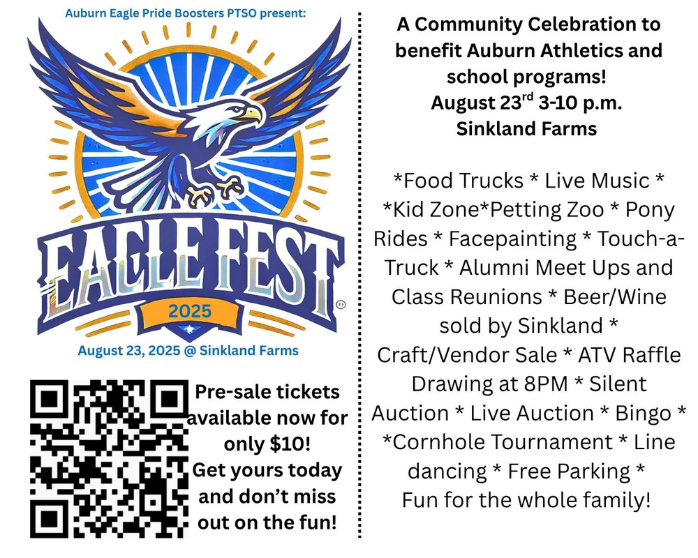 Auburn Eagle Pride Boosters PTSO presents EagleFest 2025 on Saturday, August 23, 2025 at Sinkland Farms.