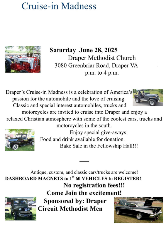 Draper Methodist Church presents Cruise-In Madness on Saturday, June 28, 2025.