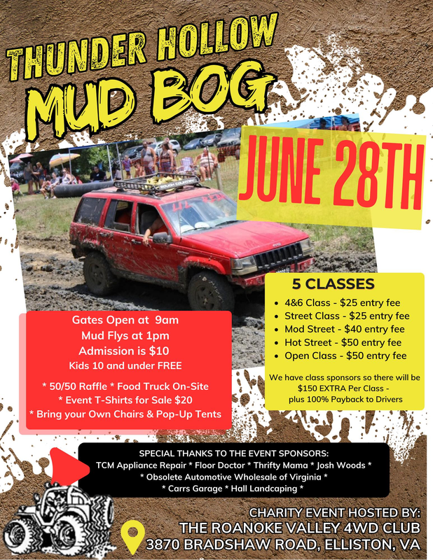 The Roanoke Valley 4-Wheelers Club presents a Thunder Hollow Mud Bog on Saturday, June 28, 2025 in Elliston, VA.