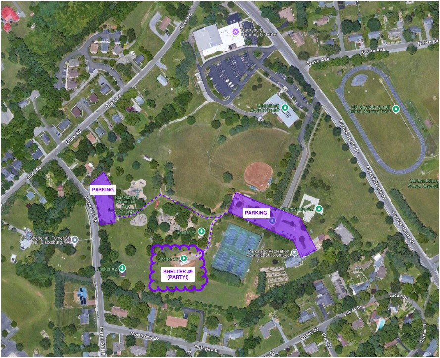 Blacksburg Municipal Park is located at 920 Turner Street in Blacksburg, VA. The Purple Party will be centrally located at Shelter #9 located off Patrick Henry Drive.