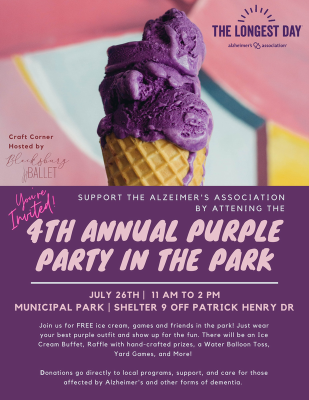 The 4th Annual Purple Party in the Park to support the Alzheimer's Association will be held on Saturday, July 26, 2025 at Blacksburg Municipal Park in Shelter #9 off Patrick Henry Drive.