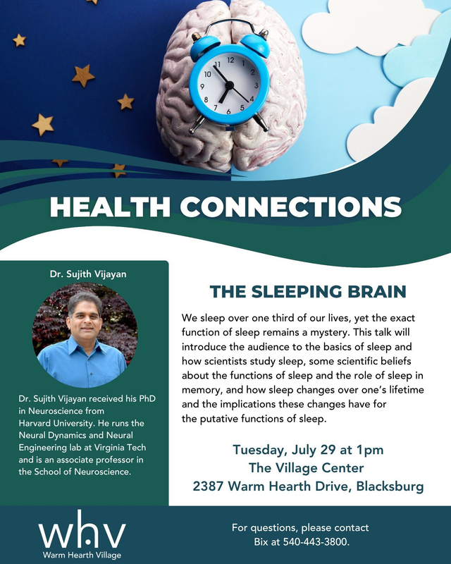 Warm Hearth Village continues their Health Connections series with the theme "The Sleeping Brain" on Tuesday, July 29, 2025 at Warm Hearth Village Center.