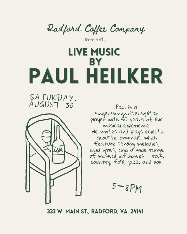 Radford Coffee Company presents Paul Heilker in concert on Saturday, August 30, 2025.