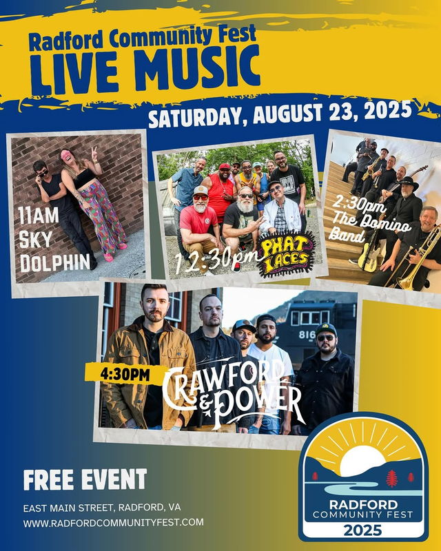 Radford University and the City of Radford presents the 2nd Annual Radford Community Fest on Saturday, August 23, 2025 on East Main Street between Tyler Avenue and Third Avenue.
