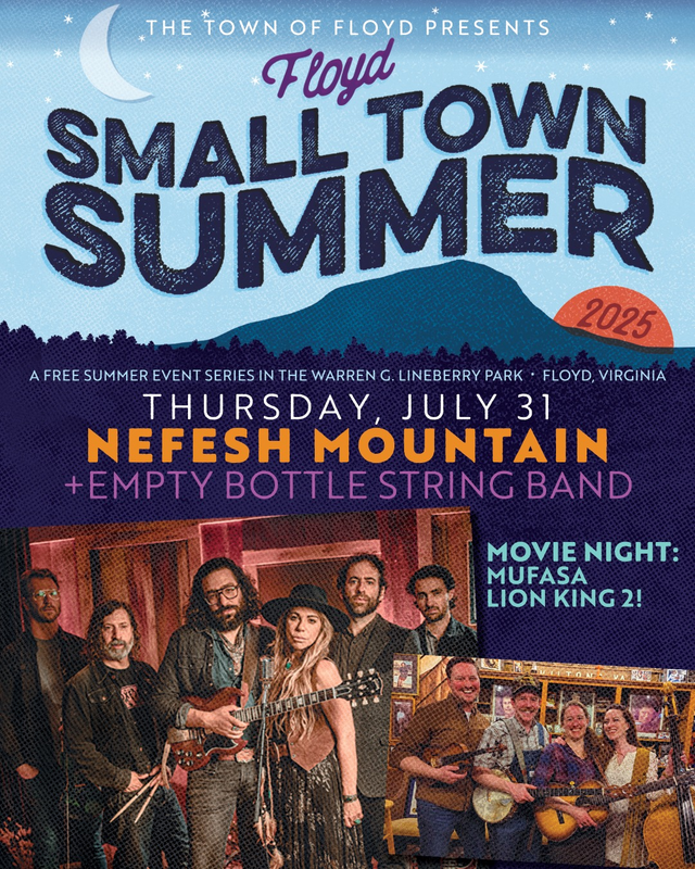 The Town of Floyd continues their 8th Annual Floyd Small Town Summer event series with Nefesh Mountain and opener Empty Bottle String Band in concert with a Movie Night showing the film "Mufasa: The Lion King" on Thursday, July 31, 2025 outside at Warren G. Lineberry Memorial Park.