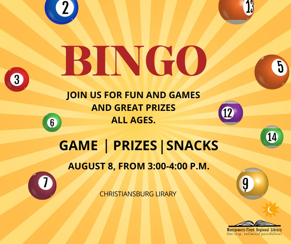 The Christiansburg Library presents BINGO for all ages on Friday, August 8, 2025.
