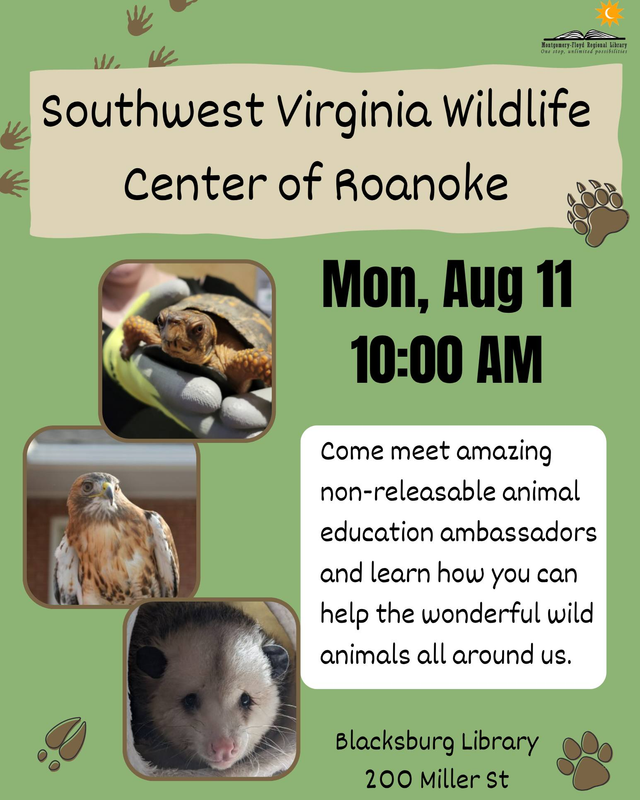 The Blacksburg Library presents SWVA Wildlife Center Animal Ambassadors on Monday, August 11, 2025.
