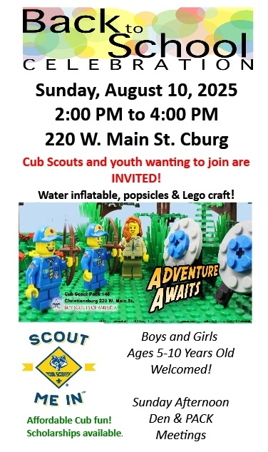 Cub Scout Pack 145 presents a Back to School Celebration on Sunday, August 10, 2025 at St. Paul United Methodist Church in Christiansburg, VA.
