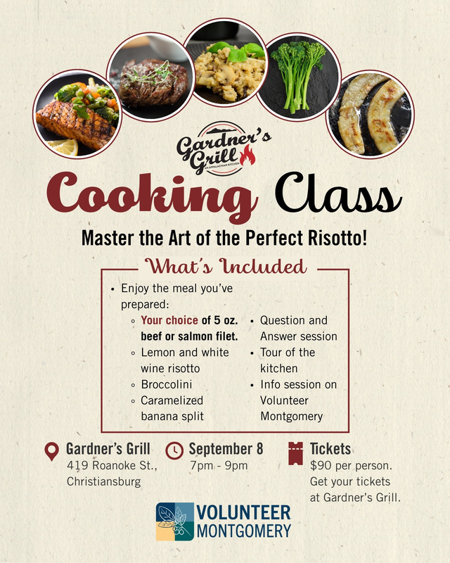 Join us for our Fine Dining Cooking Class at Gardner’s Grill! This event is a fundraiser for Volunteer Montgomery, a local nonprofit volunteer organization based in Montgomery County.