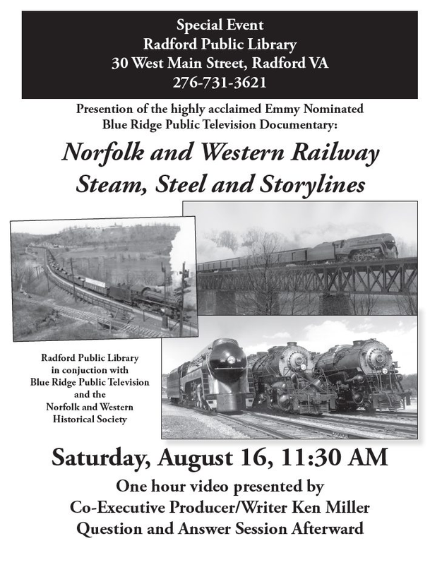 The Radford Public Library presents a screening of "Norfolk and Western Railway Steam, Steel and Storylines" with Q&A Session on Saturday, August 16, 2025.