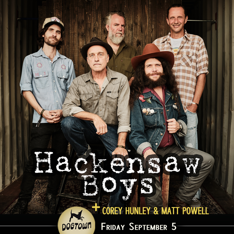Dogtown Roadhouse presents the Hackensaw Boys in concert with Corey Hunley and Matt Powell on Friday, September 5, 2025.