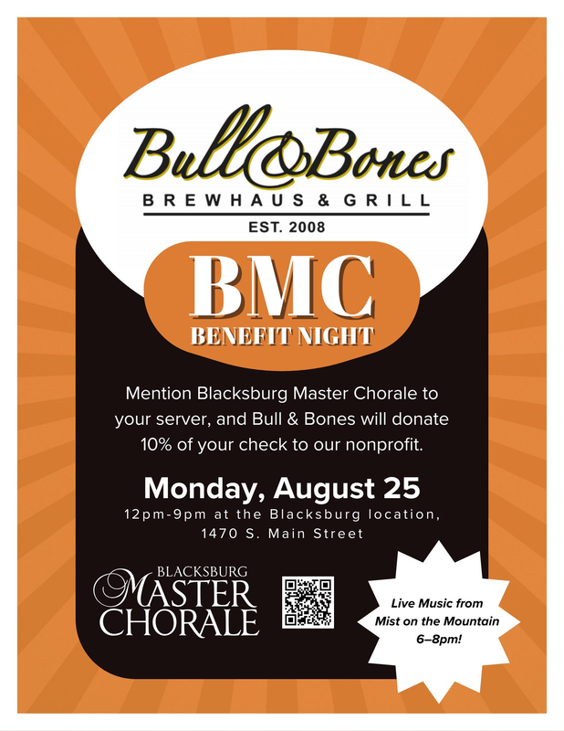 Bull & Bones Brewhaus & Grill presents a Blacksburg Master Chorale Restaurant Night on Monday, August 25, 2025.