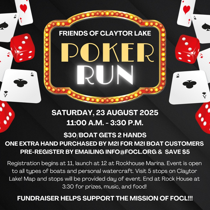 The Friends of Claytor Lake (FOCL) present their 2025 Poker Run on the Water on Saturday, August 23, 2025 starting and ending at Rock House Marina.