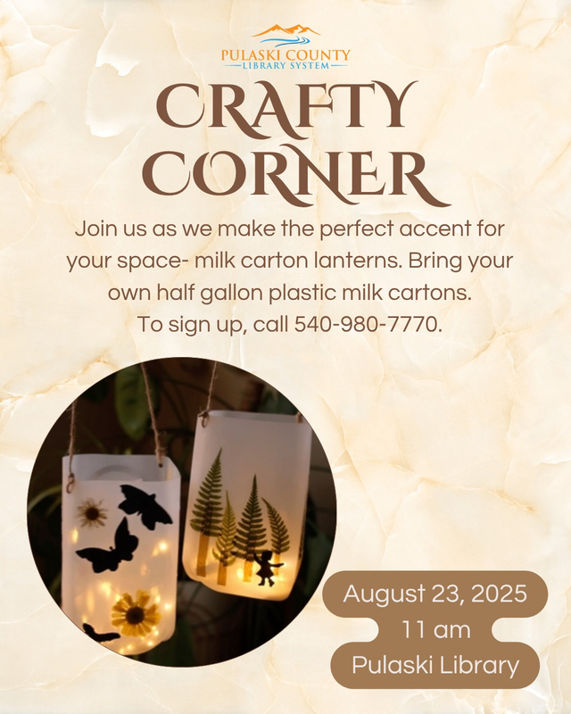 The Pulaski County Library continues their monthly "The Crafty Corner" series for August with the craft "Milk Carton Lanterns" on Saturday,