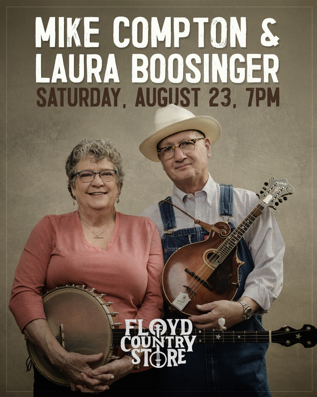 The Floyd Country Store presents Mike Compton & Laura Boosinger in concert on Saturday, August 23, 2025.