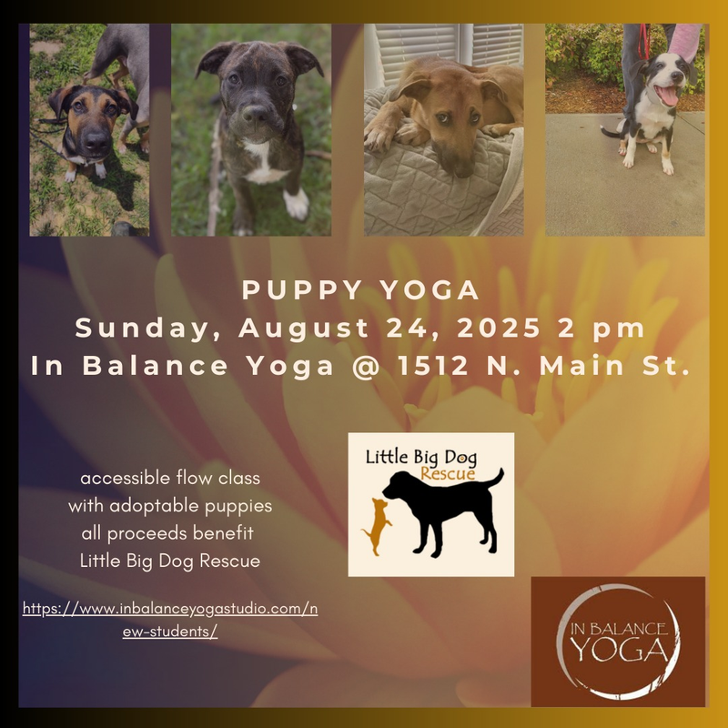 In Balance Yoga Studio presents Puppy Yoga with Little Big Dog Rescue on Sunday, August 24, 2025.