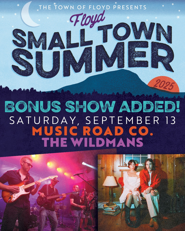 The Town of Floyd has added a Bonus Show for their 8th Annual Floyd Small Town Summer event series with Music Road Co. and The Wildmans and a special screening of "The Wild Robot" on Saturday, September 13, 2025 outside at Warren G. Lineberry Memorial Park.