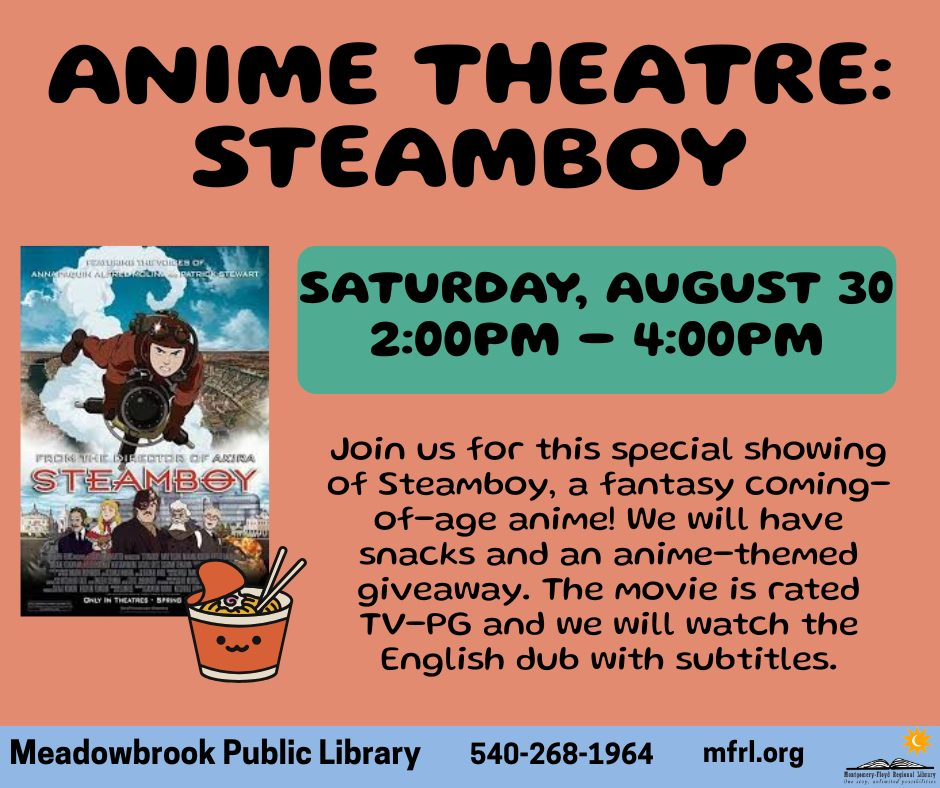 The Meadowbrook Public Library presents Anime Theatre: Steamboy on Saturday, August 30, 2025.