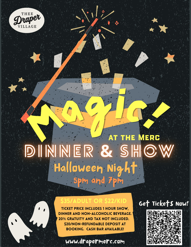Draper Mercantile and Trading Company presents "Magic at The Merc: a Magic Show on Halloween Night" on Friday, October 31, 2025 with two performances at 5:00 PM and 7:00 PM.