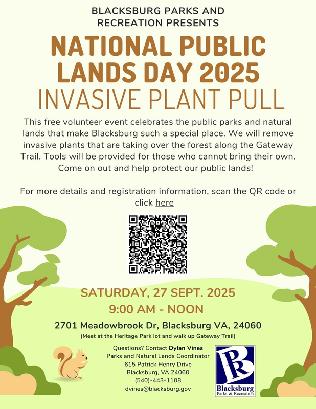 Join Blacksburg Parks and Recreation as we celebrate National Public Lands Day with a volunteer invasive plant pull. We will remove invasive plants that are taking over the forest along the Gateway Trail.