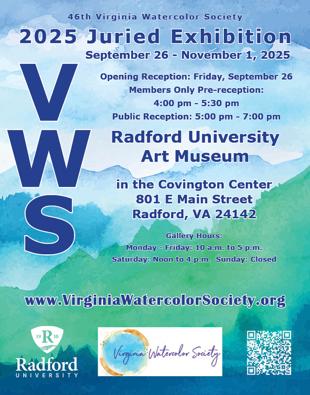 The Radford University College of Visual & Performing Arts presents the 46th Virginia Watercolor Society Juried Exhibition Opening and Reception on Friday, September 26, 2025 at the Covington Gallery located within the Covington Center on the campus of Radford University.