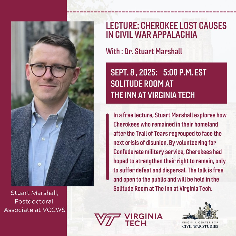 The Virginia Center for Civil War Studies presents the lecture "Cherokee Lost Causes in Civil War Appalachia" on Monday, September 8, 2025 in the Solitude Room at the Inn at Virginia Tech and Skelton Conference Center.