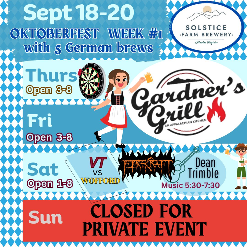Enjoy three weekends of fun with week #1 featuring five German brews on tap plus food by Chef Matt of Gardner's Grill on Thursday & Friday and Firecraft on Saturday. On Saturday, we will have Dean Trimble for entertainment and Virginia Tech Hokie football live on the TV.