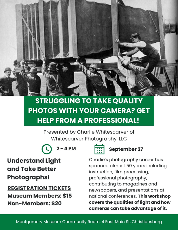 Join the Montgomery Museum’s “Understand Light and Take Better Photographs” workshop, presented by professional photographer Charlie Whitescarver of Whitescarver Photography, LLC.