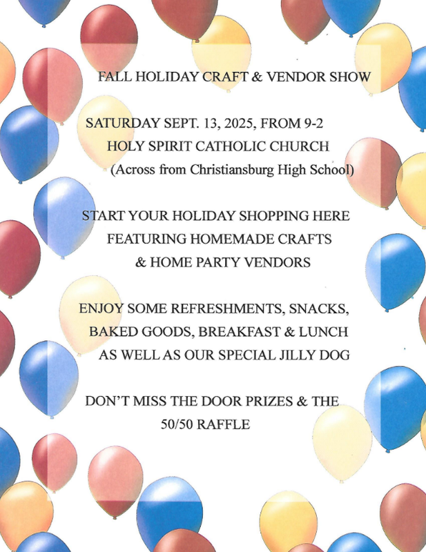 The Holy Spirit Catholic Church presents their 2025 Fall Holiday Craft & Vendor Show on Saturday, September 13, 2025.