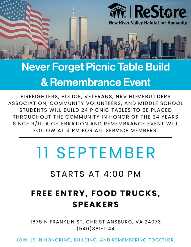 The Habitat for Humanity ReStore presents the Never Forget Picnic Table Build & Celebration on Thursday, September 11, 2025 in their parking lot.