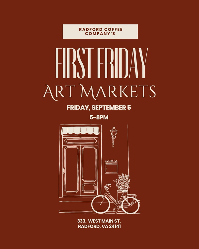 The Radford Coffee Company presents their First Friday Art Markets on Friday, September 5, 2025.