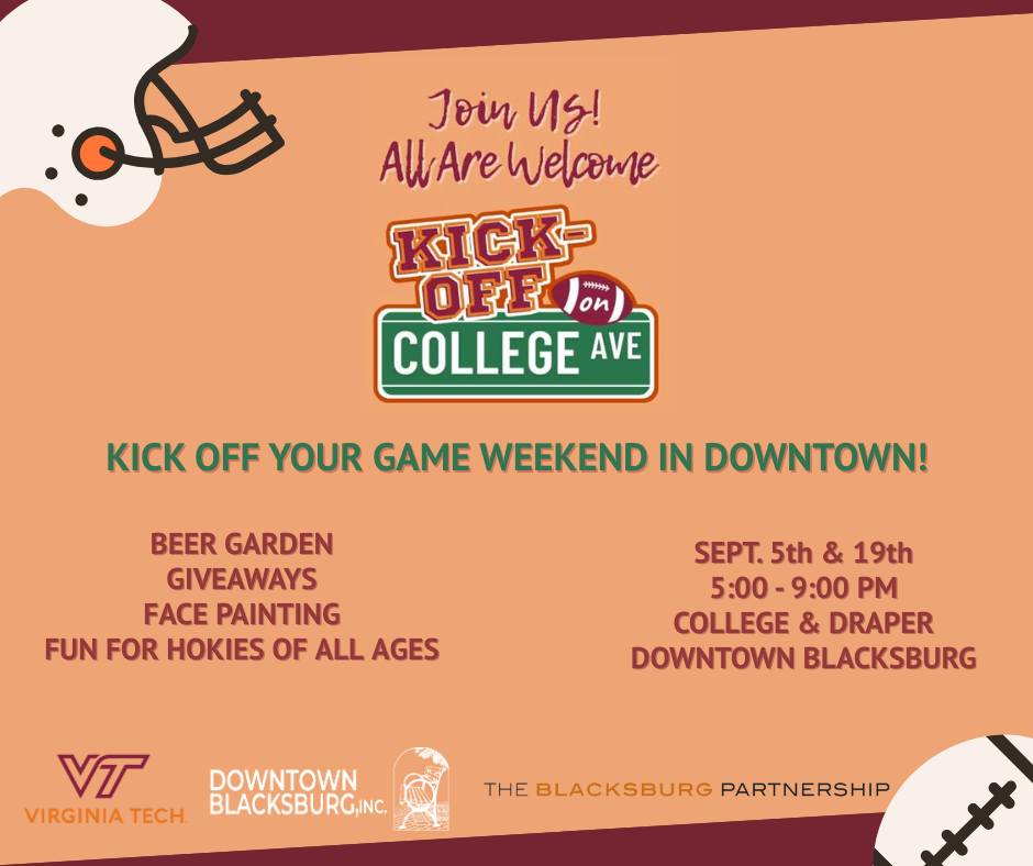 Downtown Blacksburg, Inc., Virginia Tech and The Blacksburg Partnership presents the Kick-Off on College Ave event on Friday, September 5, 2025.