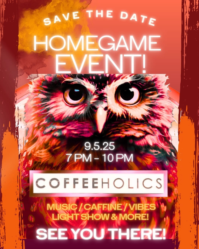 Coffeeholics presents a Home Game Event with Bass & Beans Light Show and Rave Night on Friday, September 5, 2025.