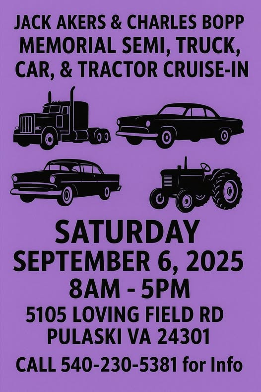 The Smilin' Jack Akers & Charles Bopp Memorial Semi, Truck, Car and Tractor Cruise-In on Saturday, September 6, 2025 at Loving Field in Pulaski, VA.