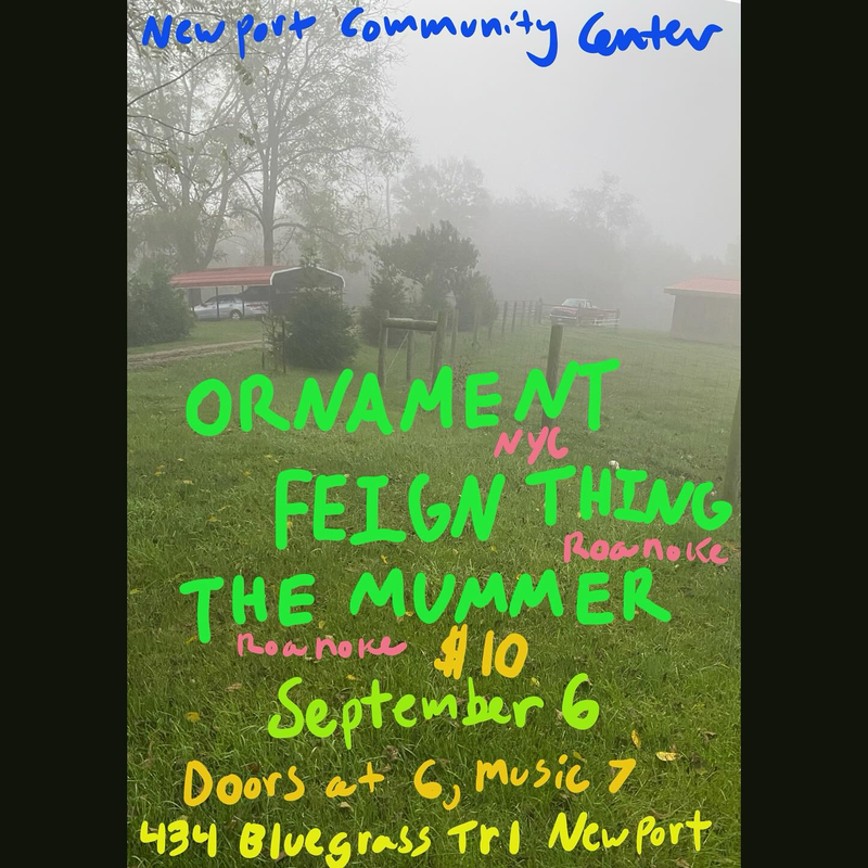 Newport Community Center presents a Three Performer Concert with Ornament, Feign Think and The Mummer on Saturday, September 6, 2025.