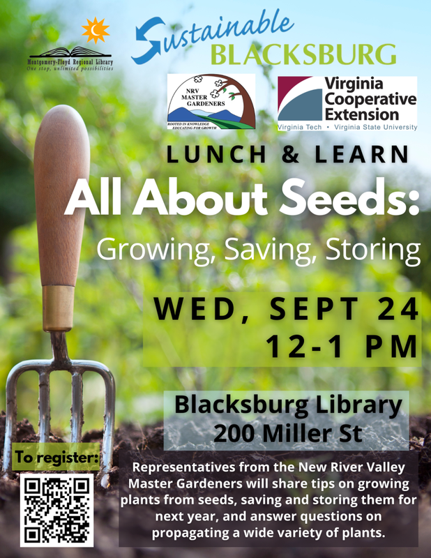 The Blacksburg Library and Sustainable Blacksburg continues their Lunch and Learn series with their September event titled "All About Seeds - Growing, Saving and Storing" on Wednesday, September 24, 2025 at the Blacksburg Library and broadcast live on Zoom.