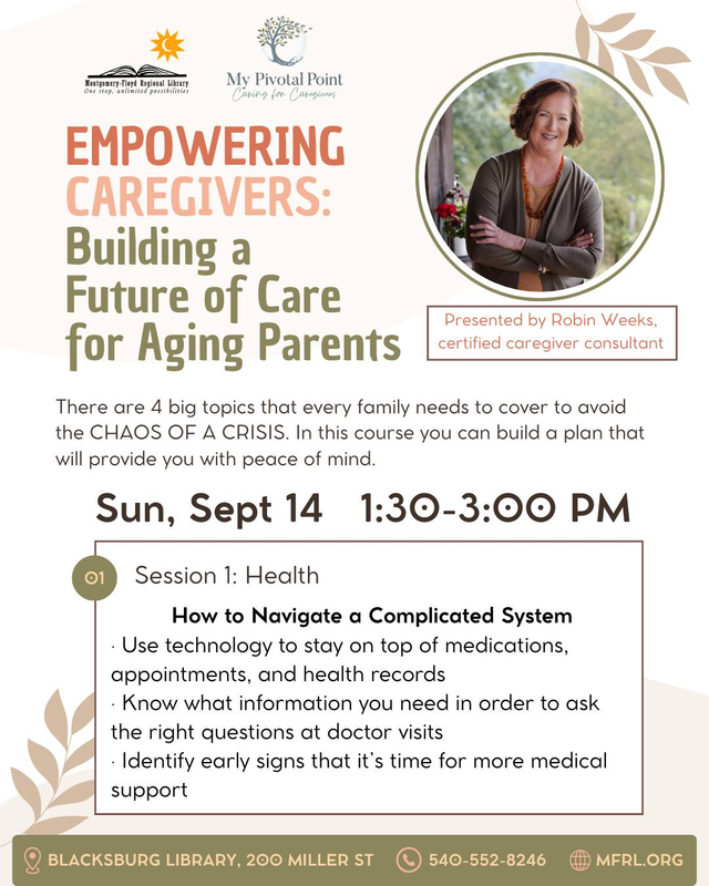 The Blacksburg Library presents the program and Session 1 of "Empowering Caregivers: Building a Future of Care for Aging Parents" on Sunday, September 14, 2025.