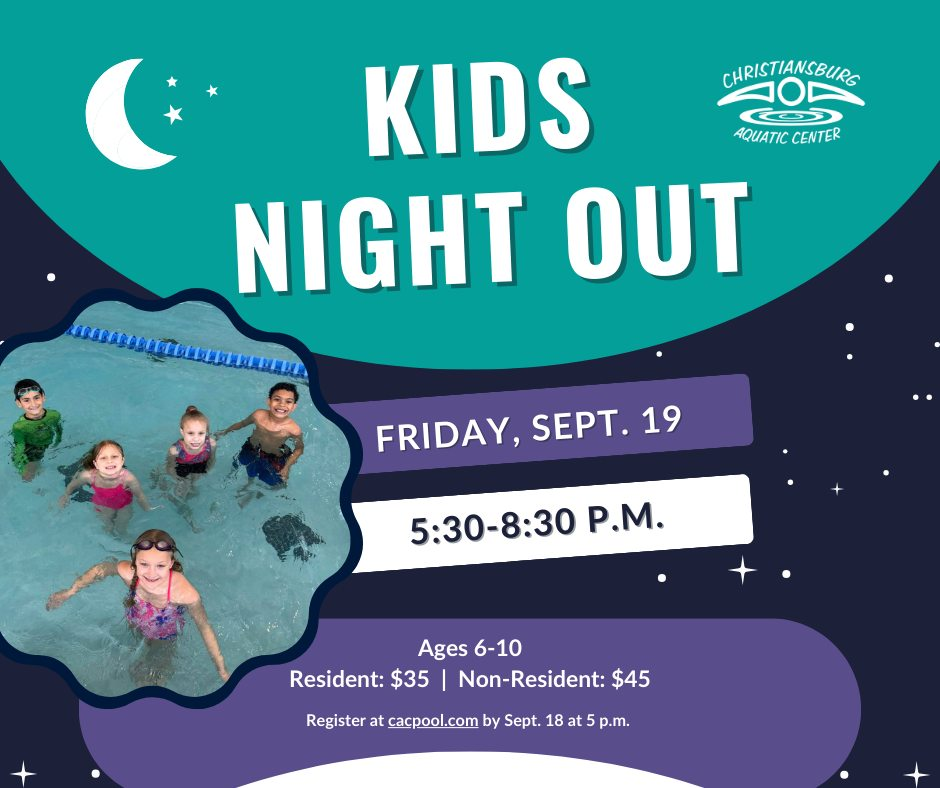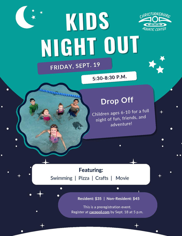 The Christiansburg Aquatic Center presents a Kids Night Out for Ages 6-10 on Friday, September 19, 2025.